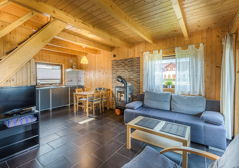 Oferujemy 6 dwupoziomowych domków letniskowych na wynajem. Każdy z nich pomieści nawet 7 / 8 osób. Goście mają do dyspozycji dwie osobne, zamykane sypialnie, które zapewnią komfort i prywatność.